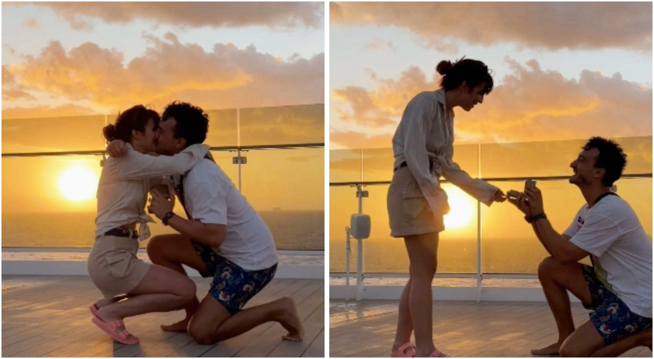 La location da sogno ai Caraibi ha reso la scena ancora più magica. La proposta, carica di sentimenti autentici, ha colto di sorpresa la futura sposa, che visibilmente emozionata si è inginocchiata per rispondere con un entusiasta “sì”, baciando Andrea in un momento di pura gioia. Le scenografie naturali delle acque turchesi e del cielo dipinto di arancione hanno fornito un contesto ideale per un evento così significativo.